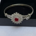 An elegant silver-tone bangle featuring a brilliant Red Flower cluster motif with sparkling CZ stones. Made from a durable alloy, this classic design includes a secure hinge closure. Perfect for formal or festive wear.